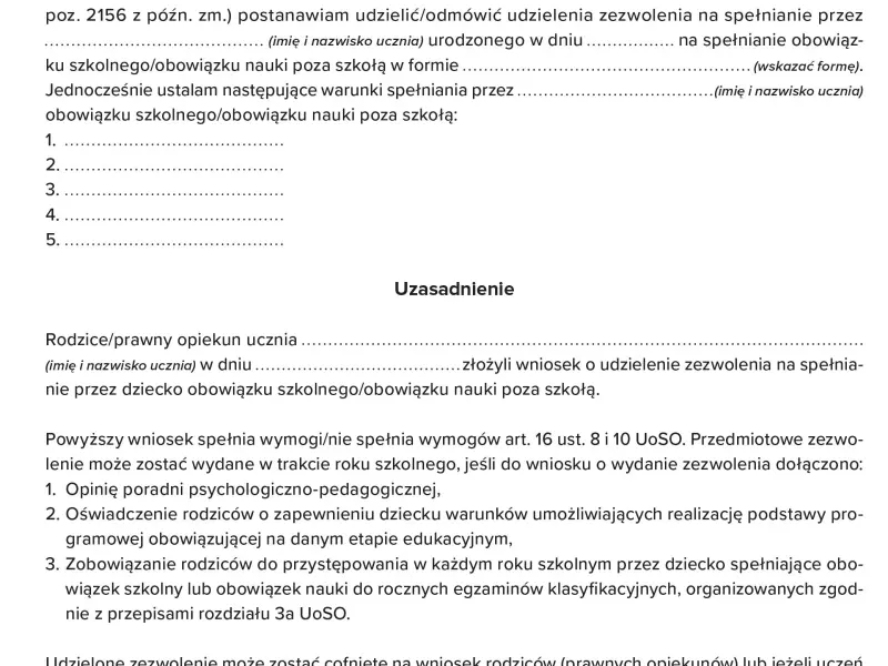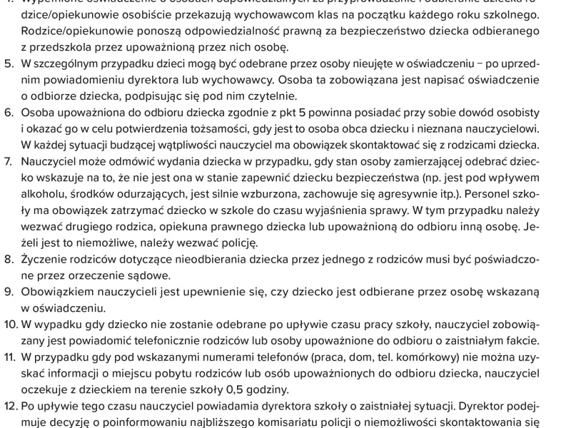 Reasumując, w przypadku dwojga rodziców dysponujących pełnią władzy rodzicielskiej zapisanie dziecka do szkoły czy też jego przeniesienie go może nastąpić tylko w razie uzyskania od obojga rodziców oświadczeń w tym przedmiocie i upewnieniu się, że dysponują oni pełnią władzy rodzicielskiej, a w przypadku rodzica o ograniczonej władzy rodzicielskiej – upewnienia się, że w ramach ograniczenia władzy rodzicielskiej nie odebrano rodzicowi prawa do decydowania o wyborze szkoły. Te same zasady stosować należy względem opiekunów prawnych dziecka, którzy winni okazać zaświadczenie o opiece jako dowód sprawowania nad dzieckiem władzy rodzicielskiej.
