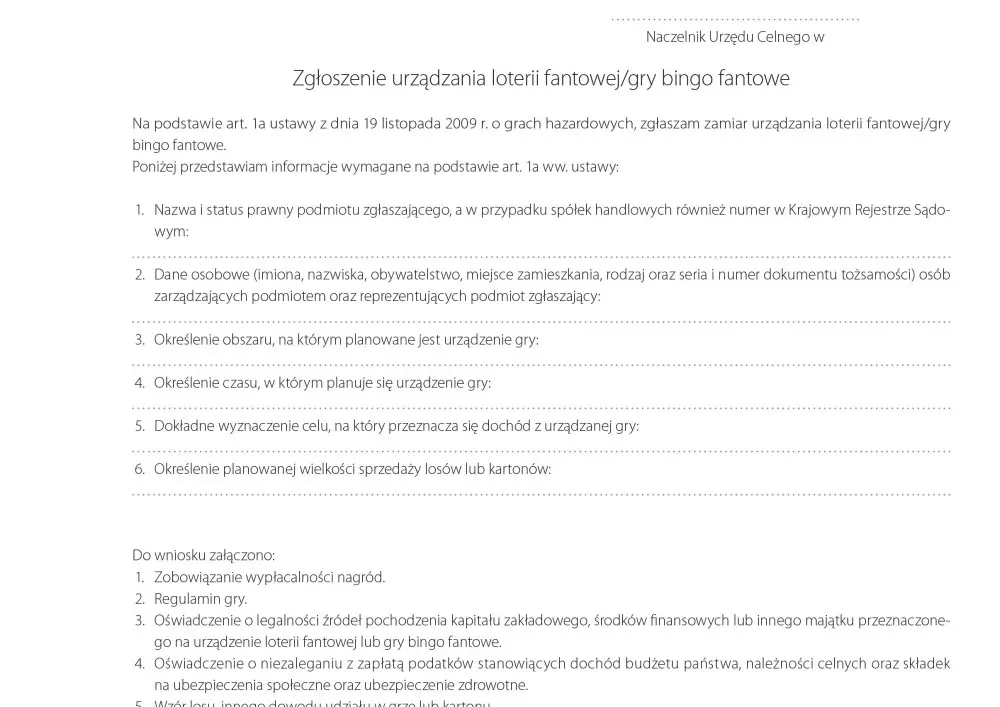 Ponadto, w dziale „Narzędziownia” znajdą Państwo wzorcowy formularz – zgłoszenie urządzania loterii fantowej/gry bingo fantowe w placówce edukacyjnej, wymagane na podstawie art. 1a ustawy z dnia 19 listopada 2009 roku o grach hazardowych. Zgłoszenia składa się nie później niż 30 dni przed rozpoczęciem loterii do właściwego miejscowo naczelnika urzędu celno-skarbowego.