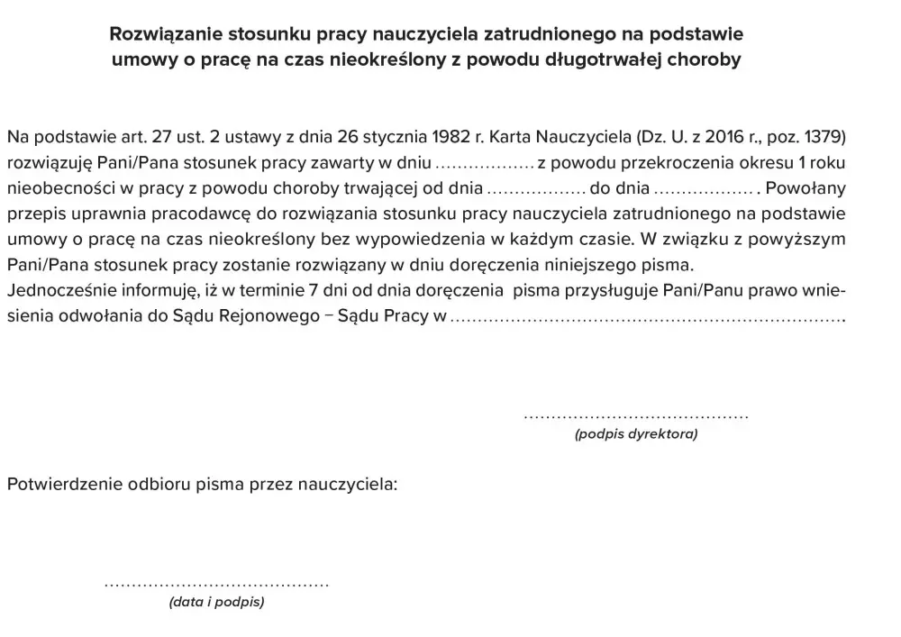 - Rozwiązanie stosunku pracy nauczyciela zatrudnionego przez mianowanie z powodu długotrwałej choroby – wzór pisma,