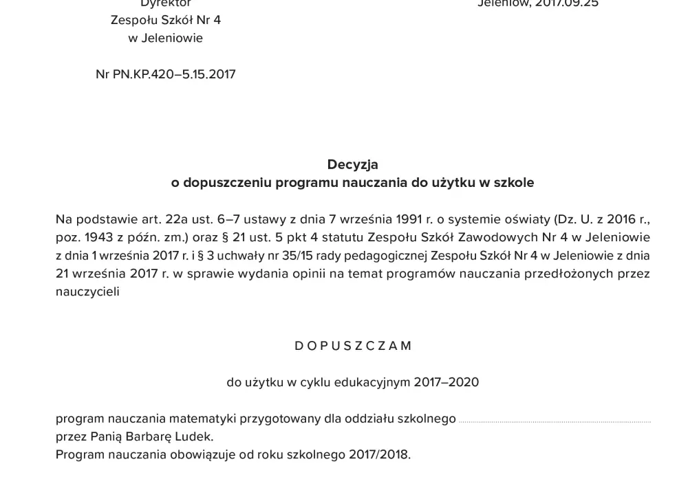 - Decyzja o dopuszczeniu programu nauczania do użytku w szkole – przykład,