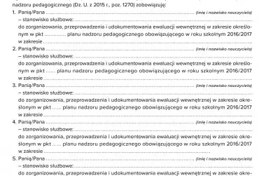 Zarzadzenie wsprawie wyznaczenia nauczycielom zadan w ramach przeprowadzania wewnetrznego nadzoru pedagogicznego