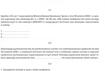 Zarzadzenie dyrektora wsprawie wprowadzenia dodatkowych dni wolnych od zajec lekcyjnych